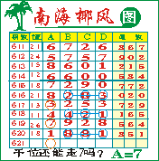 “南海椰风”第1621期推荐版局规律,本期千位57走三步.
