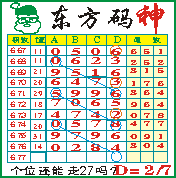 “东方码神”第1677期推荐此隔板规律,本期个位站“27”走第三步.