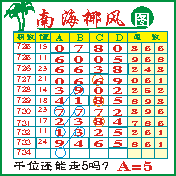 “南海椰风”第1734期推荐版局规律,本期千位57走三步.