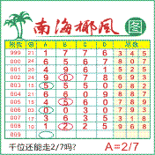 “南海椰风”第2009期推荐版局规律,本期千位27走三步.