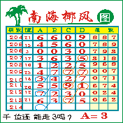 “南海椰风”第2014期推荐版局规律,本期千位35走三步.
